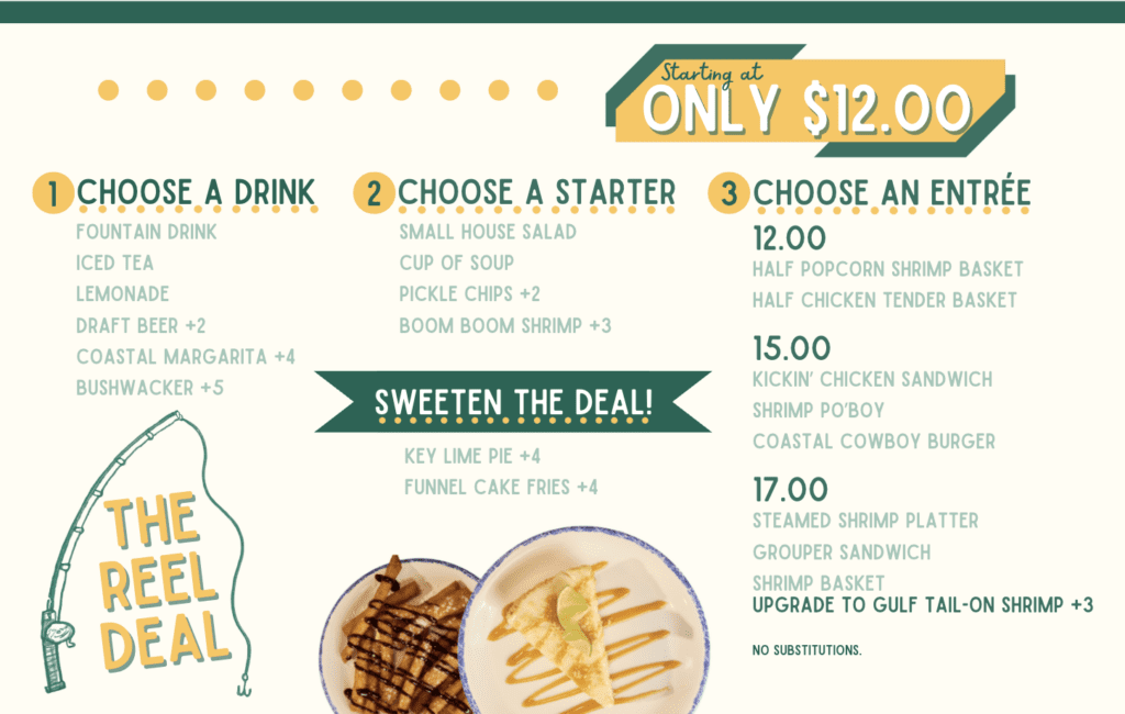Introducing The Reel Deal — our limited-time offer that’s big on taste and easy on your wallet. Starting at just $12, enjoy a complete meal that includes: